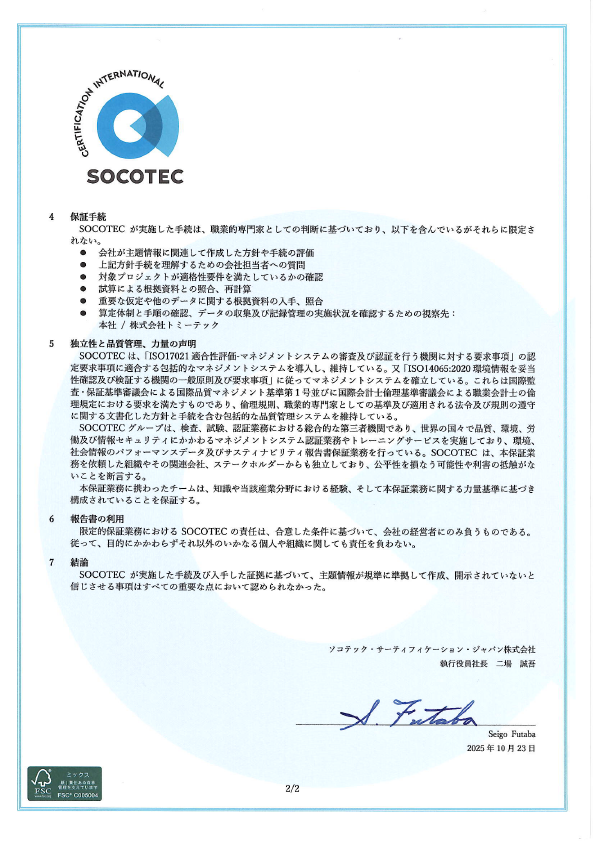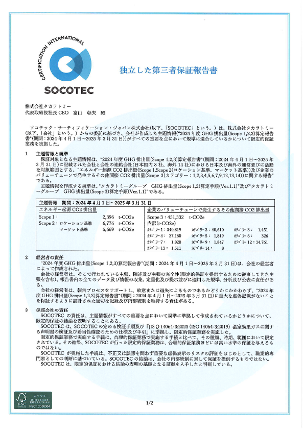 タカラトミーグループは、スコープ1、2およびスコープ3のうちのカテゴリー1(購入した製品・サービス)、2(資本財)、3(スコープ1,2に含まれない燃料およびエネルギー関連活動)、4・9(輸送・配送 上流・下流)、5(事業からでる廃棄物)、6(出張)、7(雇用者の通勤)、12(販売した製品の廃棄)、13(リース資産 下流)、14(フランチャイズ)ならびに廃棄物排出量のソコテック・サーティフィケーション・ジャパン株式会社による第三者検証を受けています。