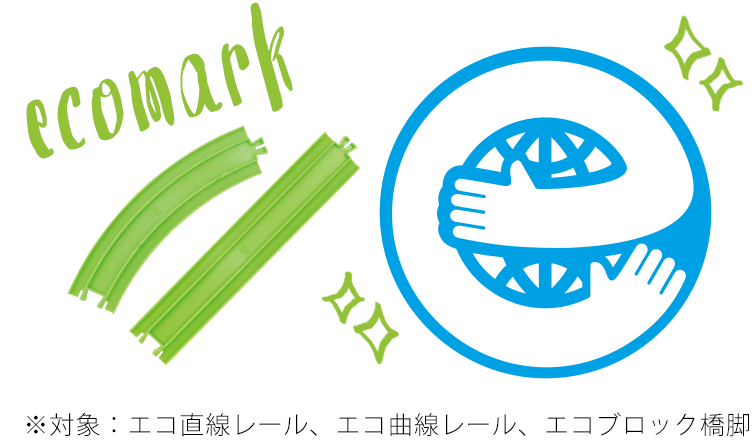 このエコなレールは3年にわたる研究開発を経ておもちゃとしての安全品質や発色を保てるよう研究を重ね、2012年に発売。同じ年におもちゃで初めて公益財団法人 日本環境協会のエコマークを取得し、「エコマークアワード2012」において最高賞の金賞を受賞しました(基準「おもちゃづくりがエコ:再生材料の使用」。