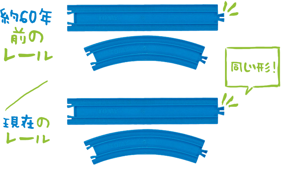 このように、「にぎやかアナウンス!サウンドE7系新幹線かがやきレールセット」には環境に配慮したポイントがありますが、実は、「プラレール」には1959年の発売当初から取組んでいるエコがあります。それは、基本規格を変えないことです。発売当初のレールと今のレールもぴったりつながります!大切にしていれば、親子3世代のレールもつなげて遊べます。