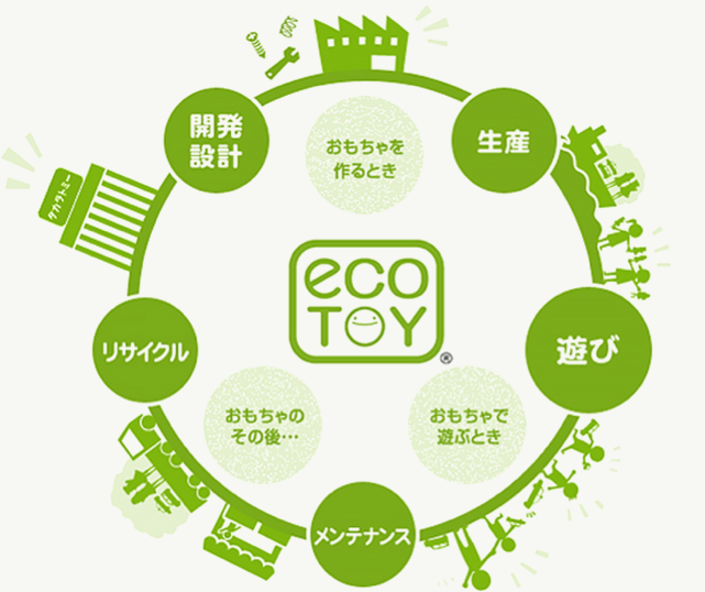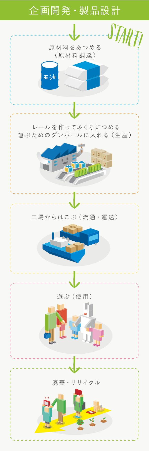 再生材料を使用することや長く遊び続けられることは、開発から遊び終わるまでの「おもちゃの一生」を考えると、実はエコにとても効果があります。