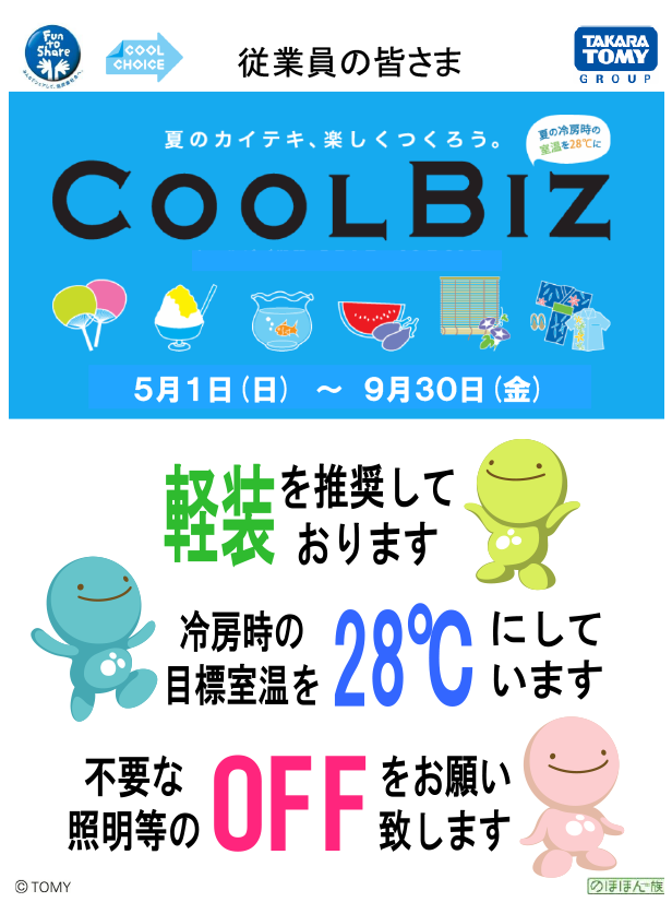 The TOMY Group supports the people’s Cool Choice campaign. Driven largely by Japan's Ministry of the Environment, the campaign is designed to help achieve a targeted 26% reduction in greenhouse gas emissions by 2030 compared to 2013 levels by encouraging people to make “cool choices” that help counteract climate change such as choosing energy-saving and low-carbon products, services and action.