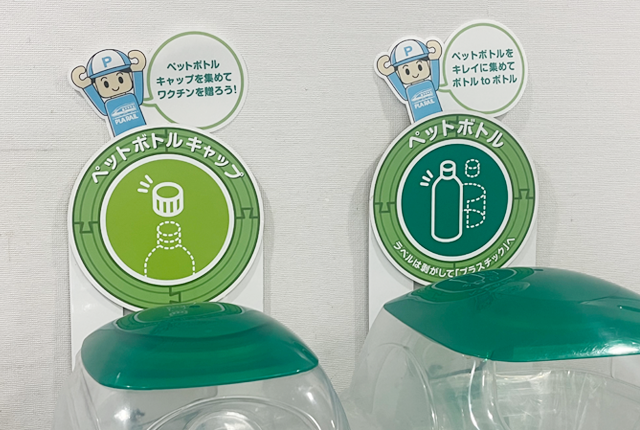 At TOMY's offices, we participate in donating vaccines for children according to the amount of plastic bottle caps collected. A portion of the proceeds from the collected plastic bottle caps is donated to the NPO "Japan Committee, Vaccines for the World's Children (JCV)" and sent out to supported countries as vaccines. The collected caps themselves are also recycled as plastic resources.