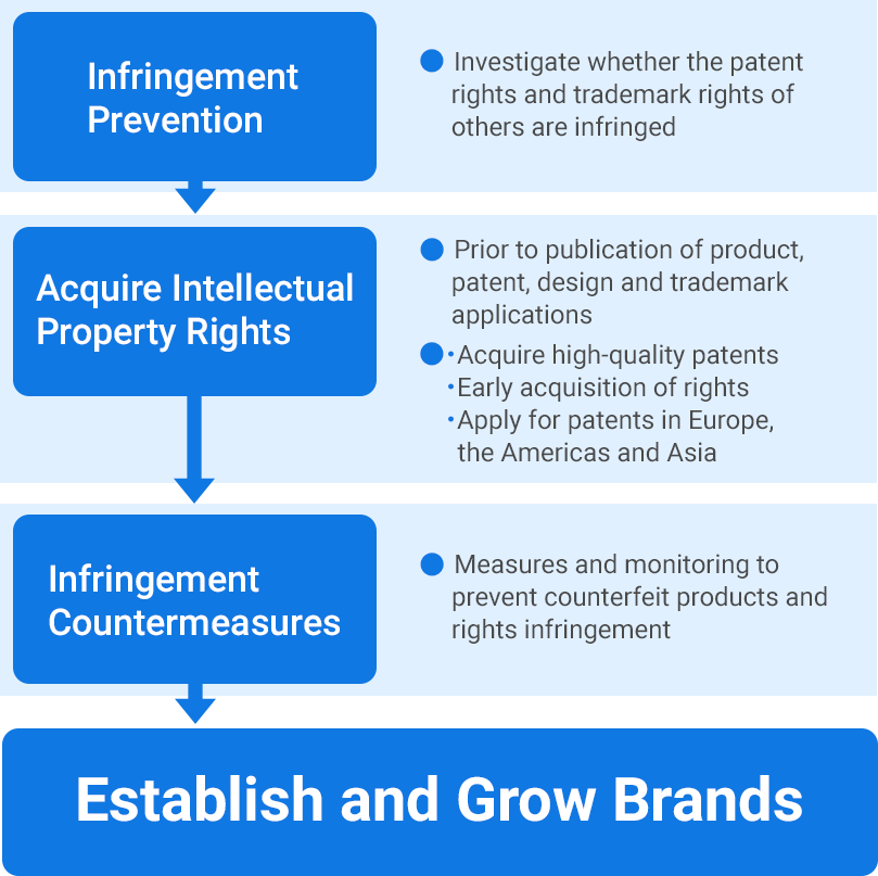 The TOMY Group actively pursues intellectual property rights for our product design, development and own unique brands, and we lead the industry in IP applications (ranked 15th in design patents acquired. Source: Japan Patent Office Statistics Data in 2020). By acquiring and holding multiple intellectual property rights for individual brands and merchandise, we establish brand value, including technologies and play, and facilitate the sustainable growth of that brand. We share information about our intellectual property across the Group, and support creative product development by actively utilizing and protecting that intellectual property. In recent years, we have also been aggressively promoting improved quality and the early acquisition of patent rights, as well as the acquisition of intellectual property rights in international markets to match our developing business in Europe, the Americas and Asia.