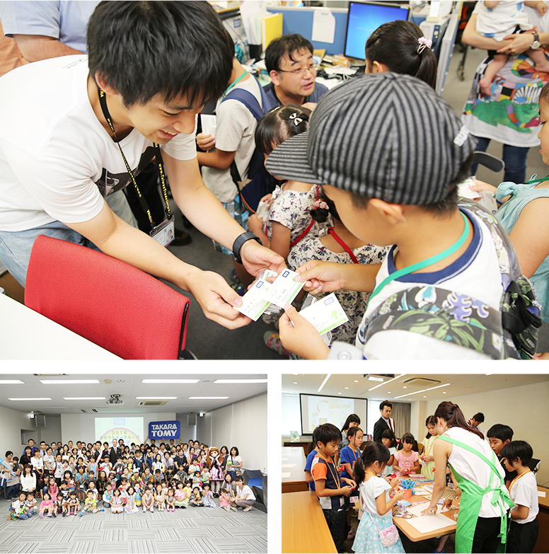 Children experienced work life for a day, exchanging business cards and touring the office. They also enjoyed fun events such as street performances by popular staff. Elementary school children and older participated in practical sessions focusing on socially responsible toy-making initiatives related to safety, the environment and accessible design.