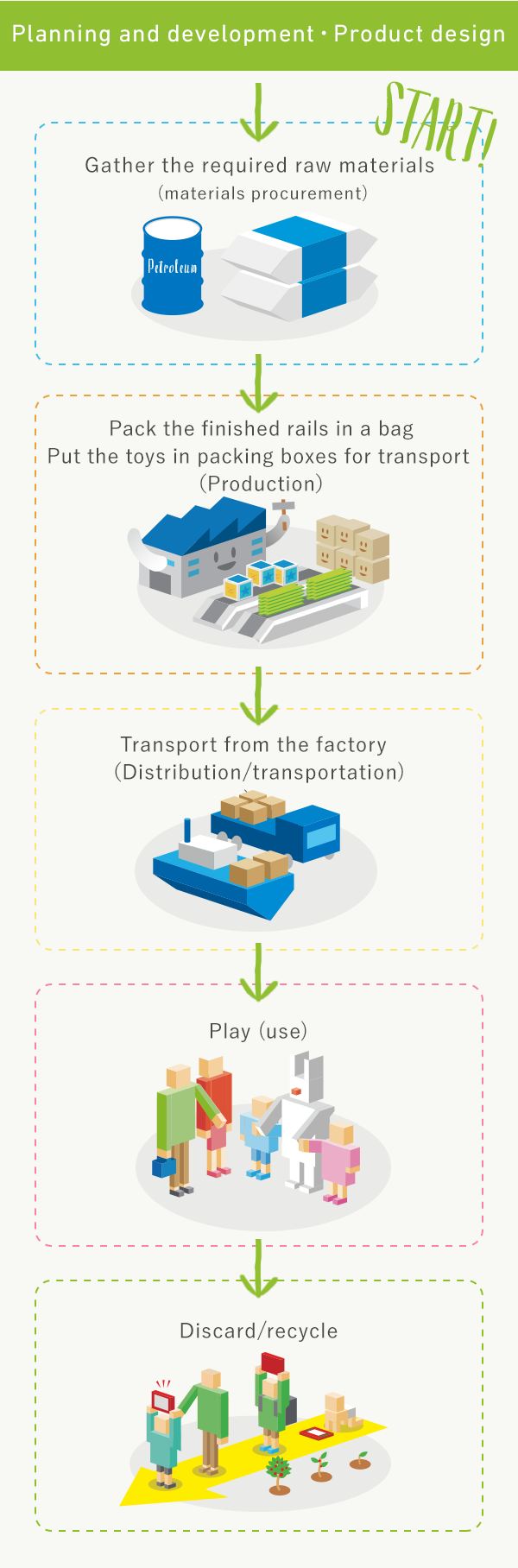 PLARAIL is famous for its blue rails but we decided to change the color to green to instantly remind customers that the rails are made from recycled materials as the symbol of PLARAIL’s eco initiatives.