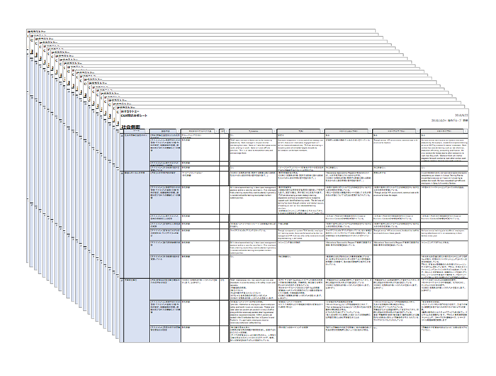 We comprehensively studied social responsibility issues and organized them into groups for priority focus analysis. We listed approximately 400 items by considering a range of factors including social responsibility guidelines (Global Reporting Initiative (GRI) Standards, ISO 26000), evaluation criteria issued by the Sustainability Accounting Standards Bureau (SASB), MSCI ESG indexes, the Sustainable Development Goals (SDGs), demands from business partners, as well as the issues our competitors are focusing on.