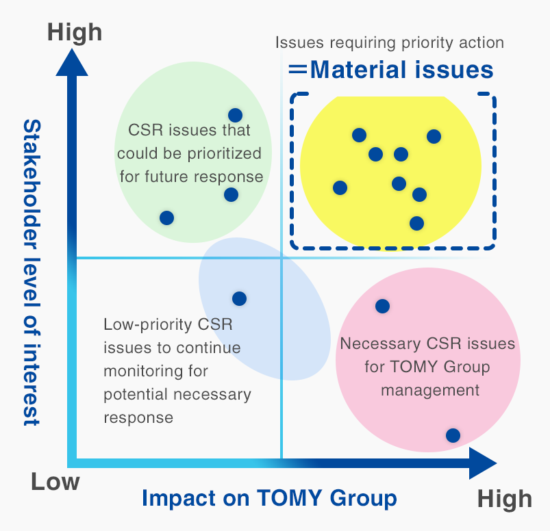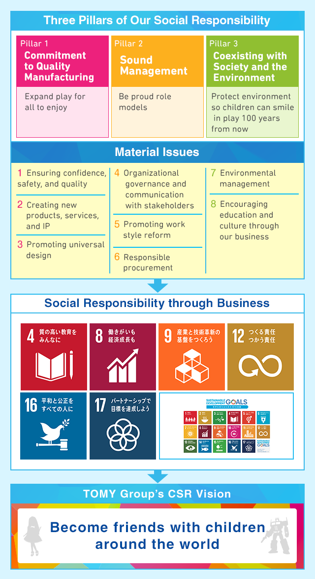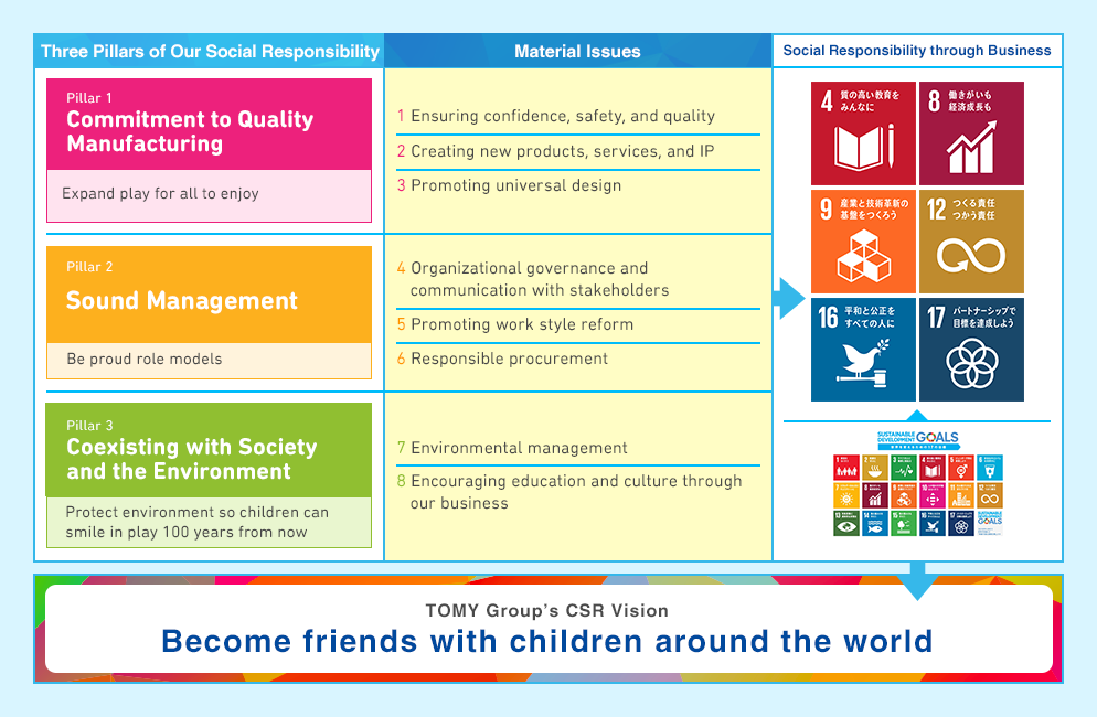 The TOMY Group has defined eight material issues for achieving its CSR vision of