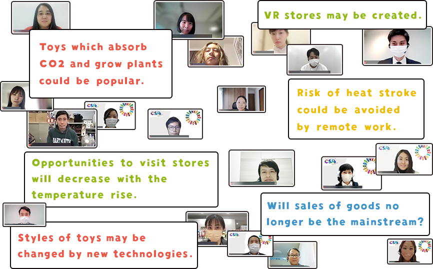 At the TOMY Group, we specifically envisioned what society will be like (scenario) in 2030 and 2050 where the temperature rise is limited to 1.5 degrees Celsius or lower compared to the pre-industrial-revolution level, as well as where the temperature rises 4.0 degrees Celsius from the above-mentioned level in 2100. We then had seven departments -- Business Department, Management Planning, Production and Procurement, Accounting and Finance, General Affairs, PR and IR, and Sustainability and CSR -- hold a discussion about the negative impact (risks) to be faced by the TOMY Group and its business opportunities associated with demand for toys and asobi(play), which are expected in the respective cases.