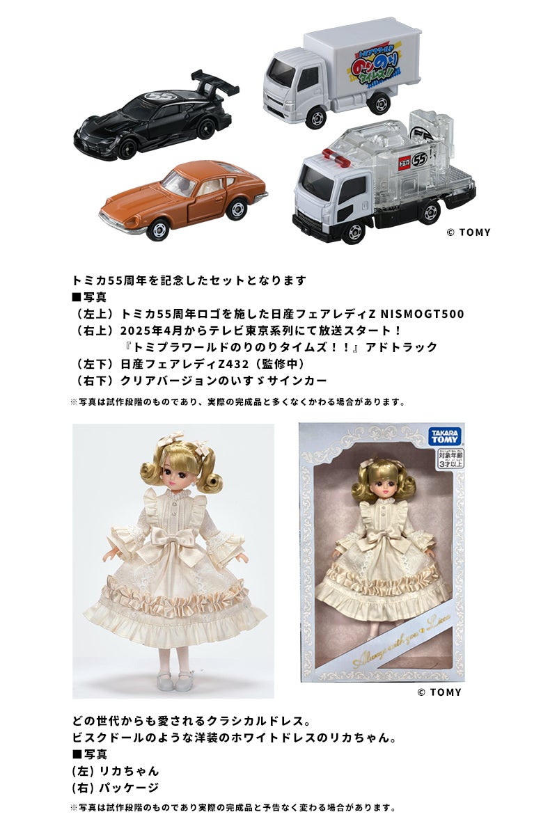 オリジナル「トミカ」4台セットおよびオリジナル「リカちゃん」 ※上記オリジナル「トミカ」4台セットと、限定版リカちゃんを予定。 |