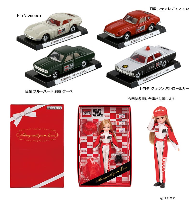 | 2,000株以上の株主様 | ・上記の50周年記念特別カラーのスポーツカー「トミカ」4台セット ・スペシャルカラーヘアのゆめかわリカちゃん |