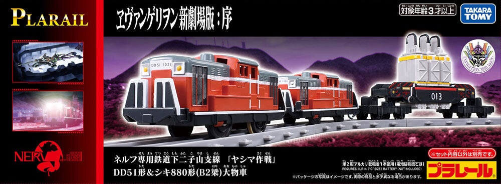 『ヱヴァンゲリヲン新劇場版:序』劇中に登場するDD51形と、「屋外型275kv超高圧通常変圧器」を搭載したシキ880形を3両編成で再現したプラレールです。「プラレール」シリーズで人気の高いDD51形は、深く「鉄道」を楽しみたい方に向けた「PLARAIL」シリーズにおいて初の商品化となります。シキ880形には番号シールが付属しており、ご自由にはりかえができます。クライマックスシーンの想像を膨らませて遊べる要素が詰まった商品です。