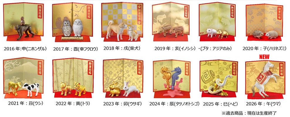 干支の慣習と「アニア」の動物モチーフを活かした「干支アニア」シリーズは、干支にちなんだ「アニア」と赤い敷物(フェルトシート)と屏風がセットで、縁起の良い華やかなデザインを提案している商品です。発売以来、新年のご挨拶や、正月飾り、お年賀の贈り物などにもご活用いただける商品としてご好評いただき、今回が第11弾になります。