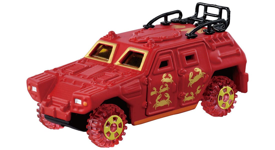 蟹がはさみを動かし幸運を招く姿を車体にデザインしました。クリアレッドのタイヤは 水辺にいる蟹をイメージしています。