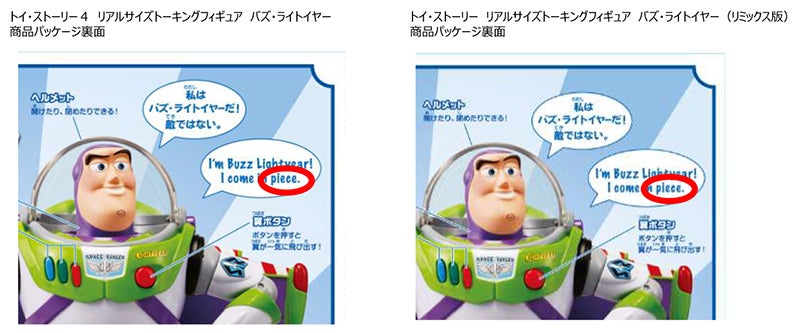 発売中の「トイ・ストーリー4 リアルサイズトーキングフィギュア バズ・ライトイヤー」「トイ・ストーリー リアルサイズトーキングフィギュア バズ・ライトイヤー(リミックス版) 」の商品パッケージ上の英文表記に誤りがございました。